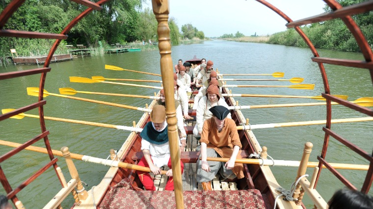 A szigethalmi Emese Park hagyományőrző múzeumfalu dolgozói eveznek egy XIV. századi dunai gálya korhű másolatával (Fotó: MTI/ Mihádák Zoltán)