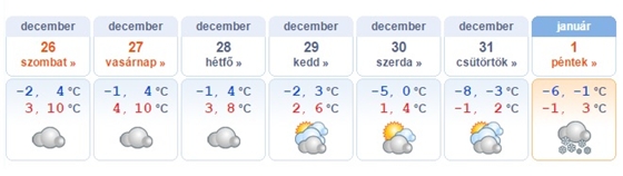 Jövő keddtől már helyenként kisüthet a nap, ugyanakkor nagyobb eséllyel felszakadozhat a felhőzet és hevesebb légmozgás is várható. Szilveszter napján a Dunántúlon már havazás is előfordulhat, az éjszakai hőmérséklet országszerte -3 és -8 fok között alakul, január 1-én pedig már az egész országban eshet a hó.