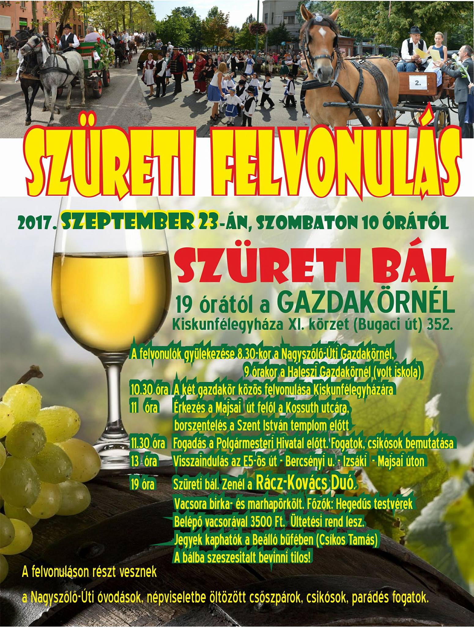 A népszerű Szüreti Mulatság színes programjainak egyike a 2017. szeptember 23-án (szombaton) 11 órakor a Kossuth utcára érkező szüreti felvonulás.