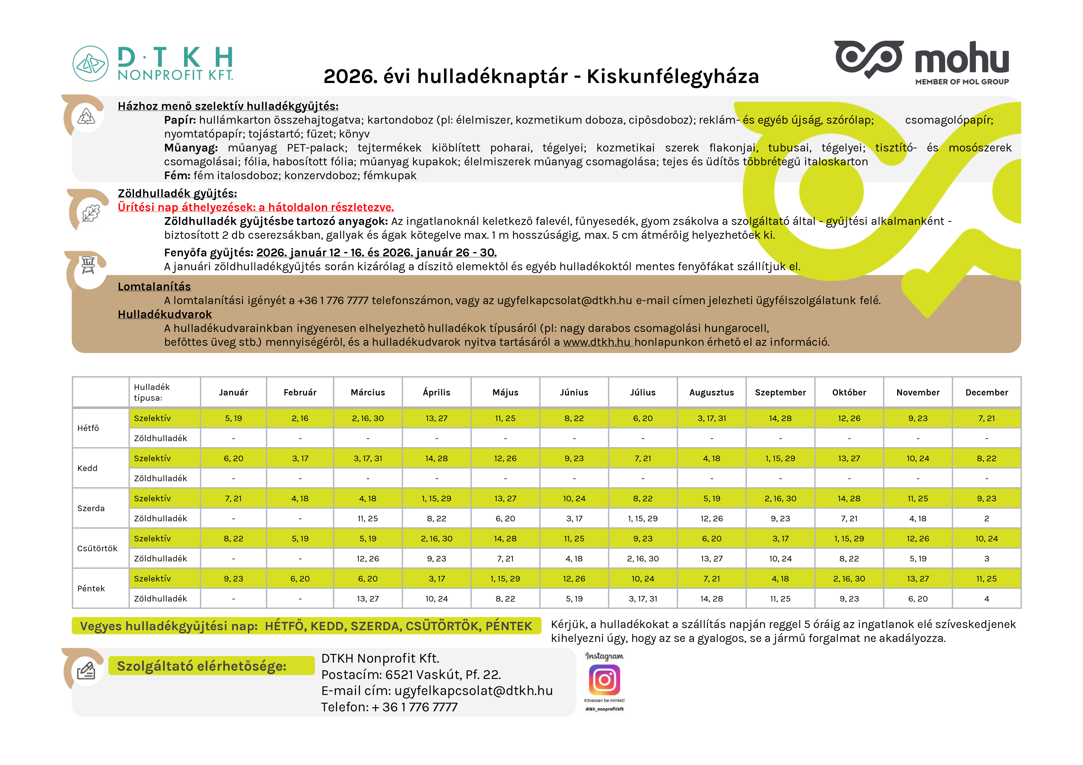 Elkészült Kiskunfélegyháza 2026. évi hulladékszállítási naptára, amely tartalmazza a kommunális, szelektív és zöldhulladék elszállításának időpontjait.
